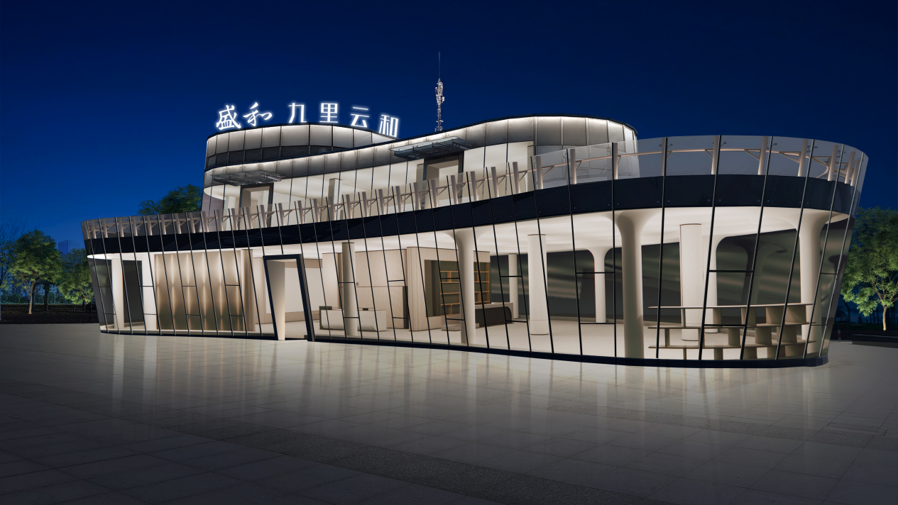 九里云和項目臨時售樓處坐落于通揚運河與通呂運河交匯處,總占地面積約460平方米,總建筑面積(含露臺)約880平方米。建筑內部布局有品牌沙盤區、會客區、露臺區等,滿足項目展示與活動舉辦需求。